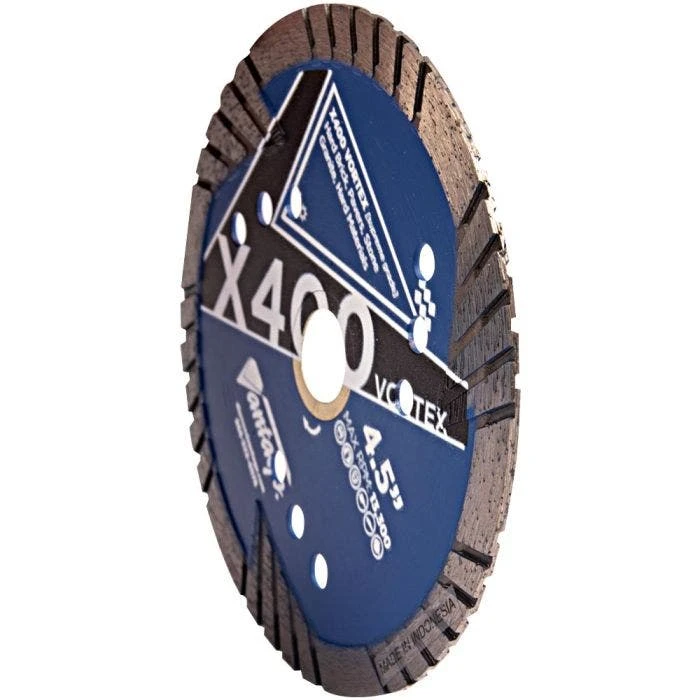 The X400 Vortex Blade has a diameter of 4 1/2″ and is .08″ thick. It also features a 7/8″ to 5/8″ knock out arbor that fits all standard angle grinders.