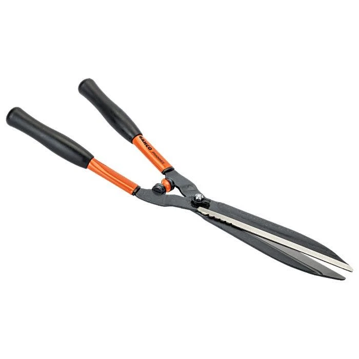 - Well balanced shear with long 9-1/2in. blades. The serrated portion is at the inner portion of the blade and allows gripping power when cutting larger woody material.