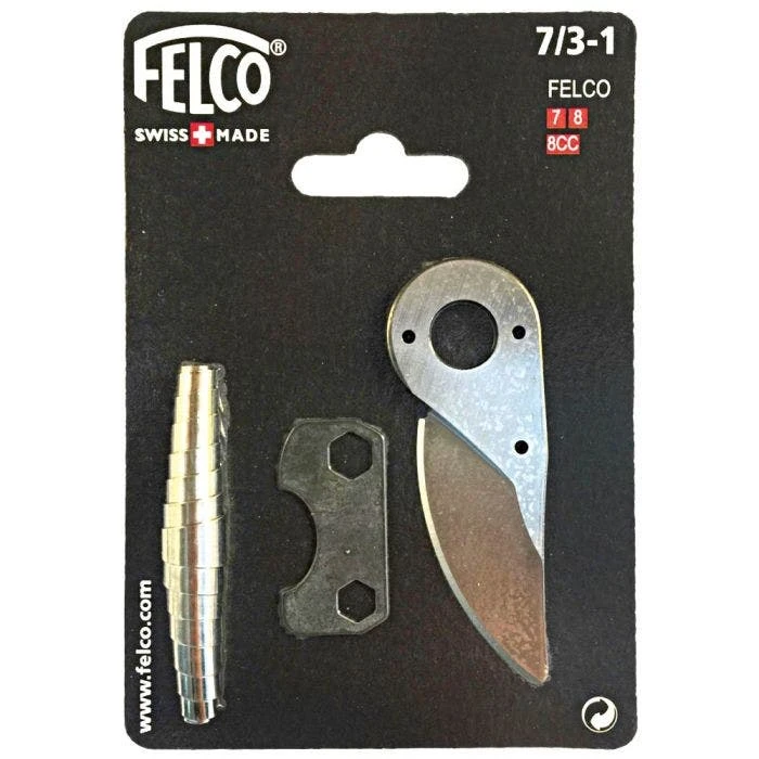 Each set contains one blade, spring and adjustment key for specified tool. This allows for the full replacement of the most common FELCO replaceable parts.