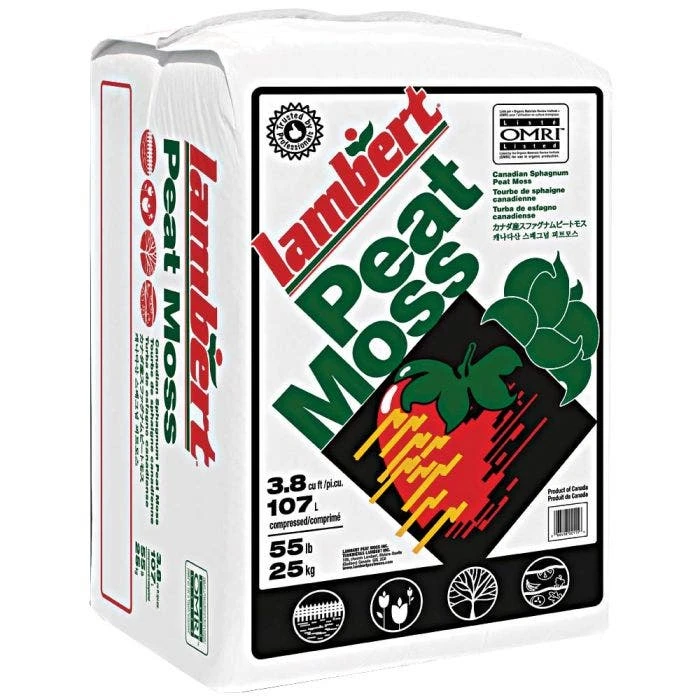 Lambert Peat Moss is a compressed bale of 100% Canadian sphagnum peat moss with medium-sized brown particles that expand to approximately 7.6 cubic feet when water is added. It is rich in beneficial organic matter and contains few sticks, making it an excellent soil and plant enhancer.