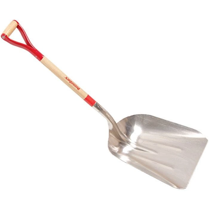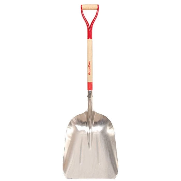 The Razor Back Western Pattern Aluminum Scoop has an aluminum head that naturally resists rust. The western pattern blade has ribs to maximize its overall strength. The light weight head attaches to a 31 inch hardwood D grip handle, which increases control when scooping and moving materials. A steel cover encases the D grip handle, preventing twisting and breaking during use. The scoop is perfect for scooping and moving grain, seed, fertilizers, and other granular materials. It also works well for general cleanup of mulch, sand, or soil. Overall length (inches): 44 3/4. Overall width (inches): 15. Overall weight (pounds): 5. Blade size: 12. Blade material: Aluminum. Blade pattern: Western. Handle material: Wood. Handle type: D grip. Handle length (inches): 31.