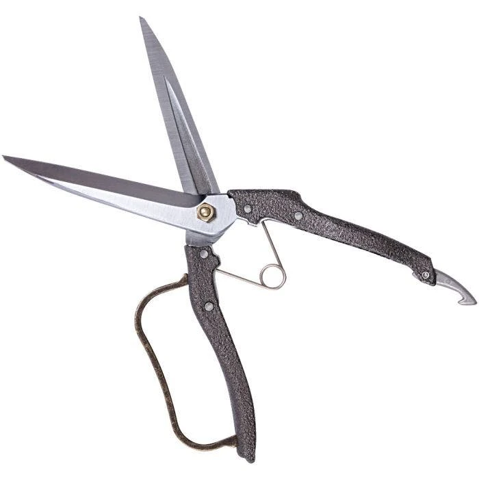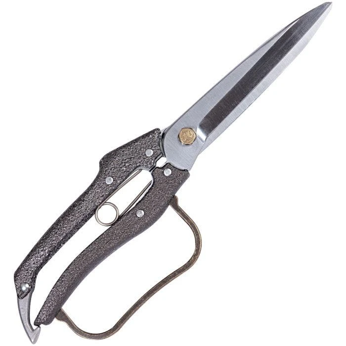 A common request for long blade shears has drawn our interest to this product. This is a magnificent quality tool that will last a lifetime! Made from high carbon heat-treated Japanese steel, the blades are hard chrome-plated to prevent rust. A specially designed locknut prevents slippage; all aluminum grip, guard wire. 4.5-inch blade length; actual cutting edge is 4 inches. The swivel latch locks the tool when not in use; metal handles have a metal finger guard. 11-inch overall length; weight of 11.2 oz.